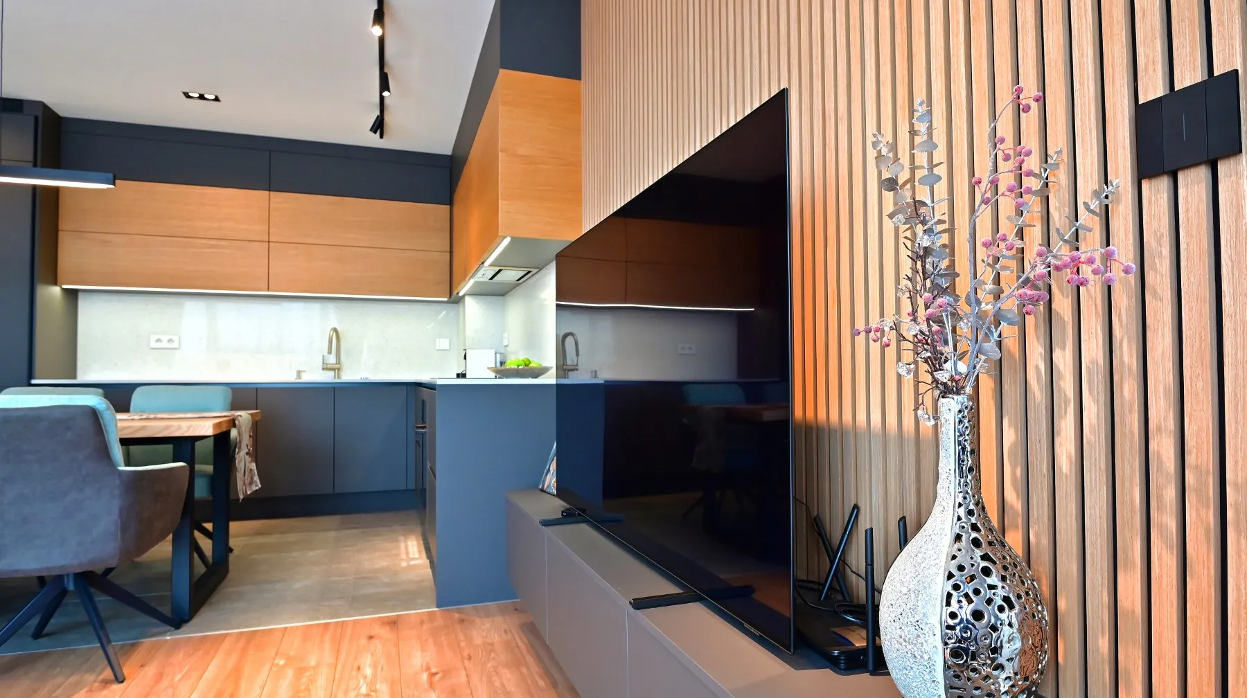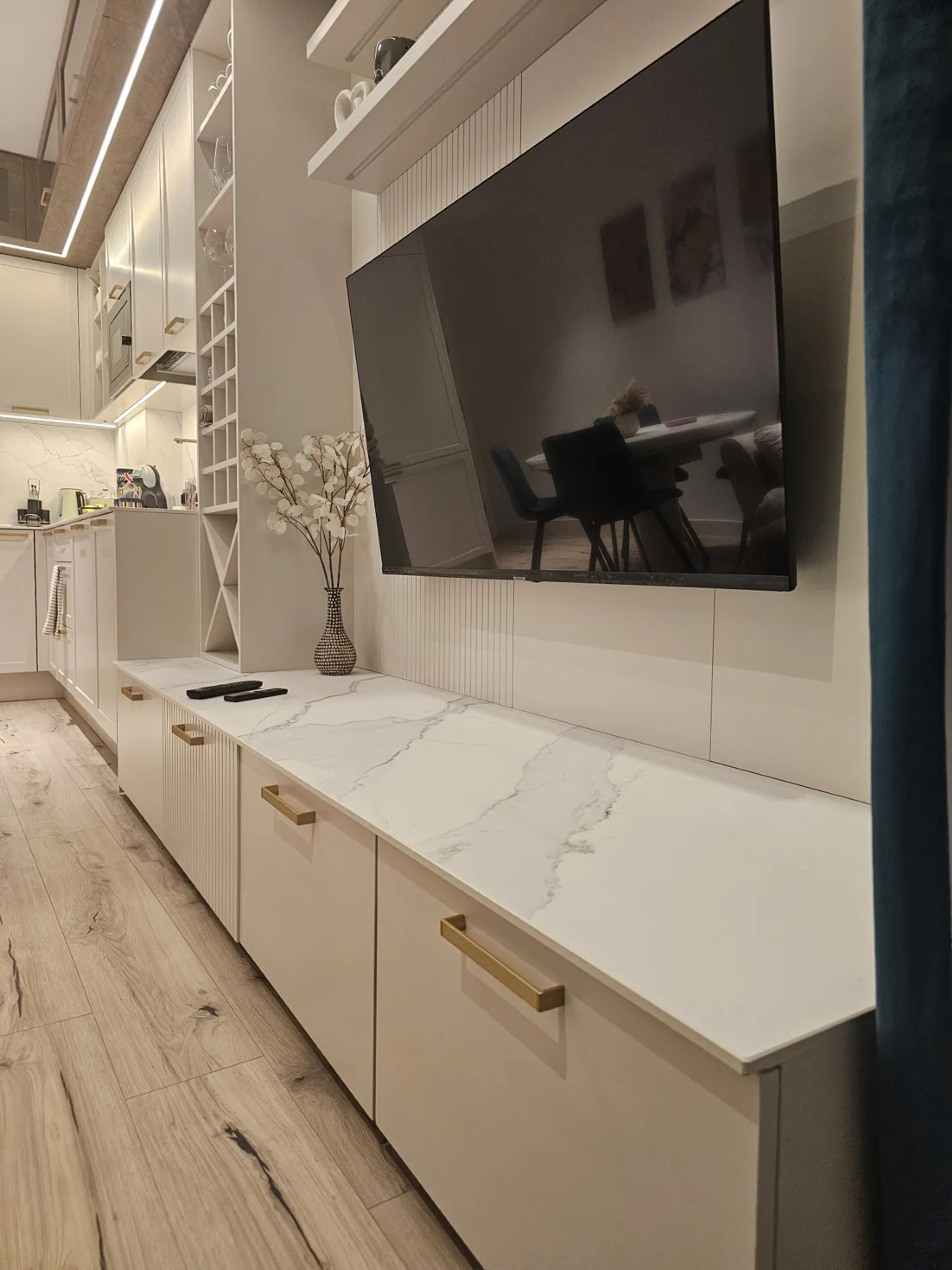 ТВ шкафове и мултимедийни мебели по поръчка, съобразени с интериора на дневната. Функционални решения с място за техника, кабели и съхранение.